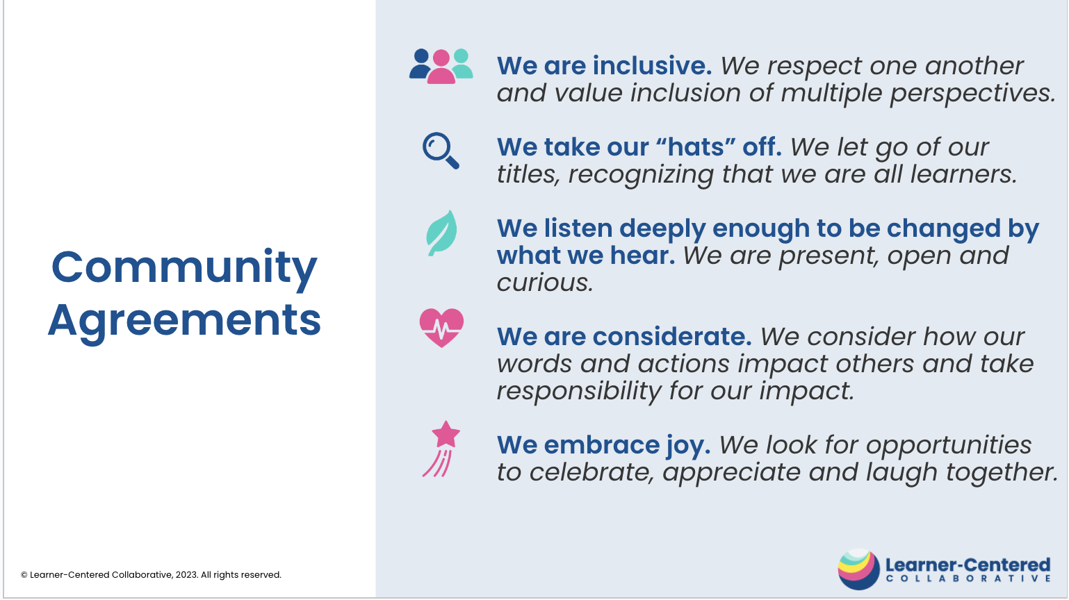 In contrast to the teacher presenting the rules to learners, a collaborative agreement can be created with learners, allowing them to shape their learning community together. Learners feel bought-in because they played a central part in the creation of the agreements. When they see their needs and hopes reflected in the agreements they are much more likely to uphold and honor them. This is often done through treatment agreements or classroom constitutions in elementary school but can be a valuable practice for secondary students and even adult learners to participate in as well, often taking the form of establishing norms.