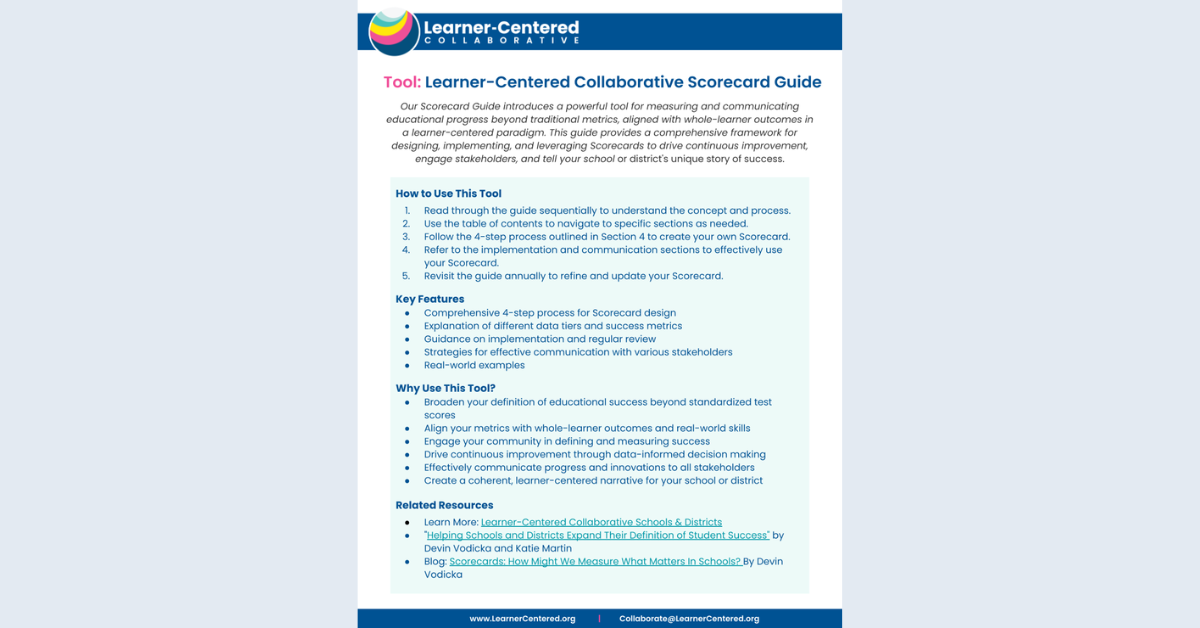 Our Learner-Centered Collaborative Scorecard Guide introduces a powerful framework for measuring and communicating educational progress beyond traditional metrics. This comprehensive guide provides a 4-step process for creating, implementing, and leveraging Scorecards to drive improvement, engage stakeholders, and showcase your school or district’s unique success story in a learner-centered paradigm. Explore this tool to…