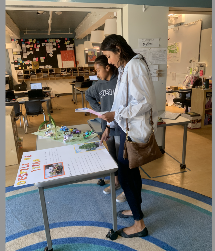 Students at a San Francisco elementary school take their family members around a museum style exhibit where different stations and displays shared each groups’ learning around Columbia in their Spanish class.
