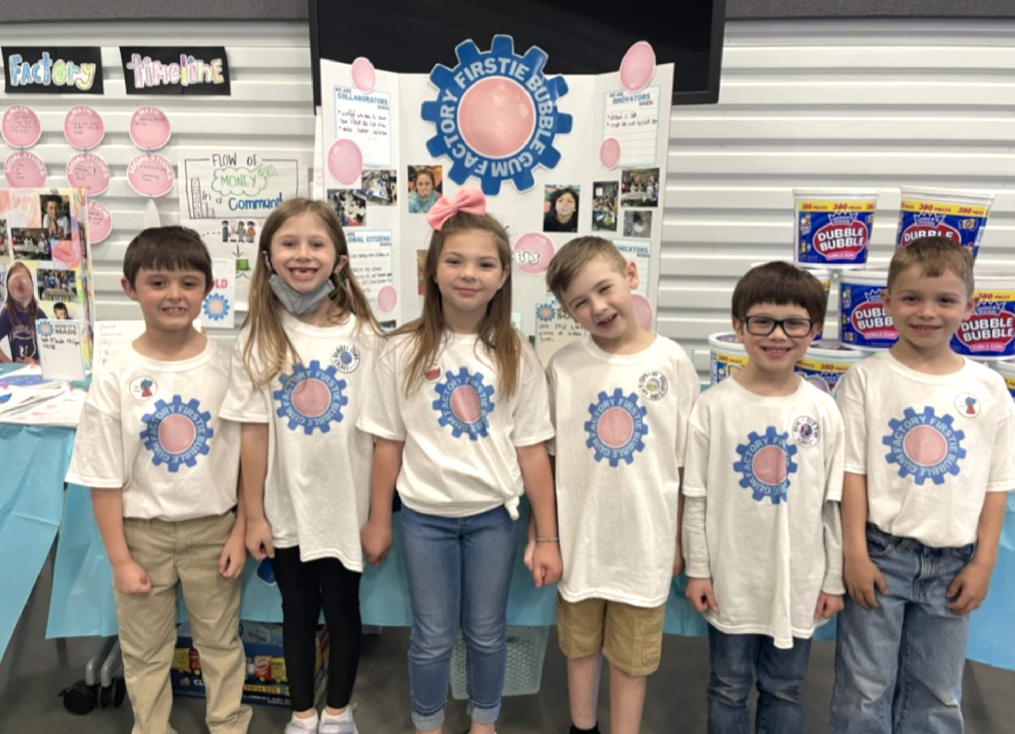 First graders in Logan County, KY celebrate their ability to learn a new skill – how to blow a bubble with gum – and document the process in writing. They created a poster and t-shirts as visual aids in their presentation at a county-wide showcase, to which all school families were invited.