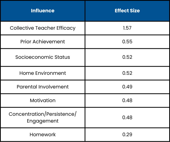 John Hattie’s research highlights the profound impact of Collective Teacher Efficacy (CTE) in schools. Hattie defines CTE as, “the shared belief by a group of teachers in a particular educational environment that they have the skills to positively impact student outcomes” (Corwin Visible Learning, 2023). Remarkably, research indicates that teacher collective efficacy has the greatest impact on student achievement compared to other factors like direct instruction, feedback, response to intervention, formative teacher evaluation, and teacher credibility.