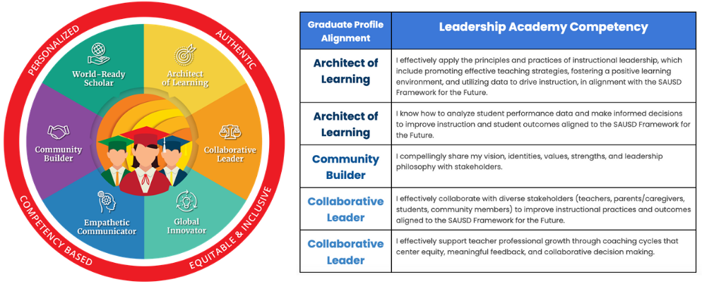We then created a framework for leadership development aligned to the SAUSD Graduate Profile. We explored what it means to be an “architect of learning” and a “community builder” in the context of instructional leadership. Then, we developed a set of leadership competencies to anchor our collective work and to define the knowledge, skills and dispositions we aspired to cultivate during our time together. Participants in the Learner-Centered Leadership Academy regularly assessed and reflected on these competencies, deepening their understanding of effective instructional leadership.