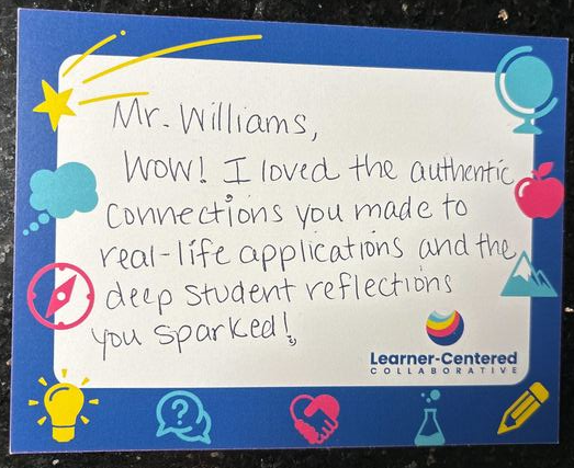 Because this is a non-evaluative moment, we recommend making efforts before and after your visit to ensure teachers understand the purpose. This can be as simple as an email ahead of time sharing when you’re coming and why. It can also include you leaving behind a short, celebratory note for the educator highlighting what you saw.