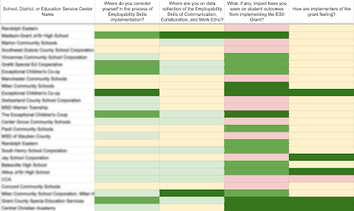 Grants were awarded to 58 schools and school corporations across Indiana to integrate three core Employability Skills: collaboration, communication, and work ethic. The scope and timeline of each project varied greatly. In order to keep a pulse check on who was where in the process, LCC worked with INDoE to develop a heatmap. Grant winners completed surveys at the end of recurring workshops throughout the process, so four intentionally crafted questions were added to the end of the survey. Grantee responses to these four questions automatically triggered color coding in the results spreadsheet, automatically creating a visual heatmap of successes and challenges. The Department was able to spot early innovators by looking for green (and conversely, offer support when they saw red).