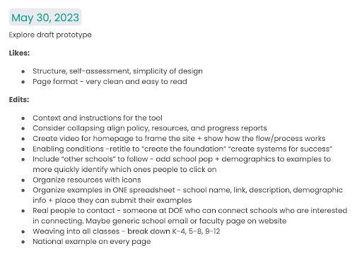 It was through this feedback team that a challenge surfaced: innovators were hesitant to share their artifacts for fear that they weren’t yet perfect. LCC and INDoE prioritized highlighting early bright spots that focused on progress, not perfection as a way to scale change. They modified the language used to invite grant winners to share stories and artifacts to showcase their approach, which led to increased participation and a broader representation of schools and contexts in the final Playbook.