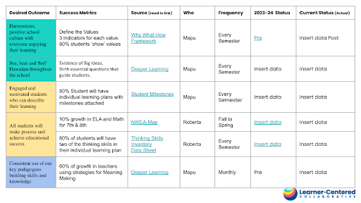 Our Learner-Centered Collaborative Scorecard includes desired outcomes, success metrics, sources, and status updates. We have also found it helpful to organize the Scorecard into “Pillars of Success” such as whole-learner outcomes, academic outcomes, culture and climate, and teaching and learning. Following are a few examples of scorecards we have developed with partners.