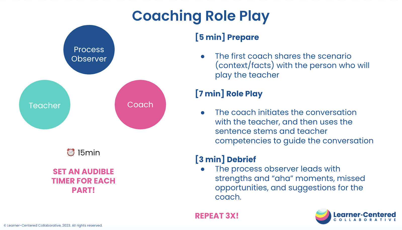 The role play can be an awkward, sweaty palmed endeavor without thoughtful structures in place. In Santa Ana, we anchored in Elena Aguilar’s Coaching Stems, first doing a scavenger hunt for Elena’s artful use of stems in several videos, before trying them out ourselves. Each participant brought a real scenario to the table to ensure that their coaching conversations were authentic and grounded in real context. We coached in triads, using a process observer to guide the debrief conversation after each coaching session. The process observer was keenly focused on how the coach positioned the teacher as the “final decision maker,” honoring their experience, expertise, and instincts instead of “choosing for them” (Knight, 2011).