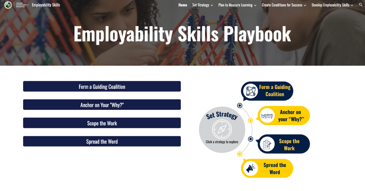 As a result of this partnership with LCC, the INDoE has a living Employability Skills Playbook, meaning that it’s not a PDF or a binder that will gather dust on a shelf. Instead, innovators are encouraged to continue to share artifacts to illuminate the newest, most effective approaches in Indiana and beyond. State, district, and school leaders will have access to the latest strategies, tools, examples, and resources to drive their own implementation of Employability Skills.