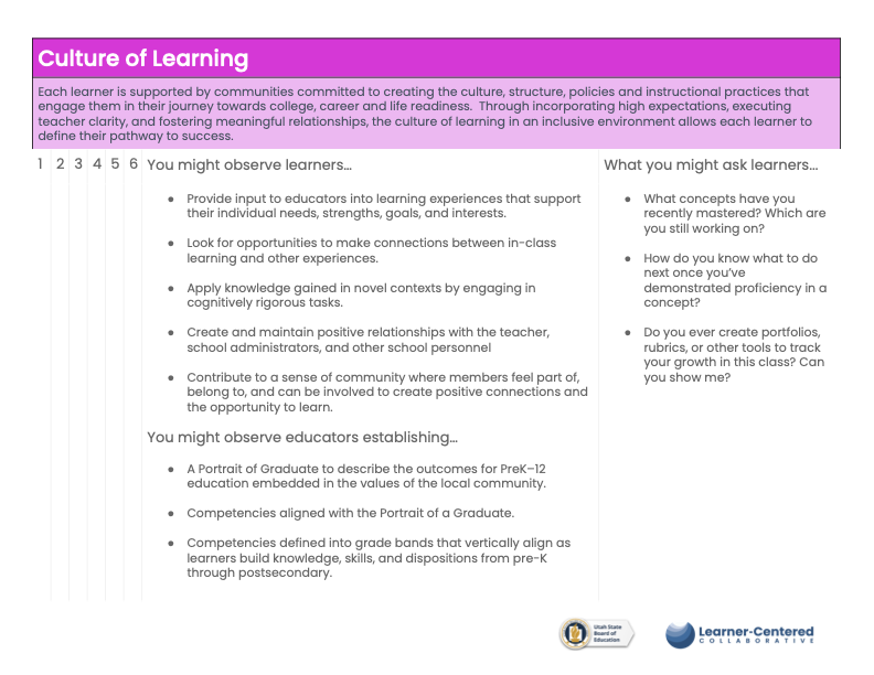 The Utah State Board of Education (USBE) partnered with Learner-Centered Collaborative to build capacity and enable USBE specialists and coordinators to support implementation of the state’s Personalized, Competency-Based Learning (PCBL) framework, a learning model that includes 5 components necessary to nurture learner-centered outcomes as defined in the state’s Portrait of a Graduate. Together, the framework and Portrait of a Graduate help Utah’s learning community, from the state system all the way to the classroom, navigate learners to a future where they can succeed and lead.
